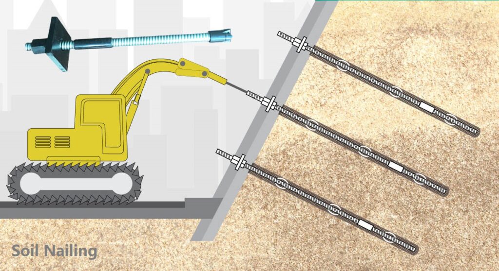 The introduction below is about Soil Nailing work, explaining the usage of the nail, where it can be used, the nailing depth required, and guidelines for the installation of hollow bar anchors. In fact, soil nailing works are different from each other. It depends on the engineer’s design. Thus, the following introduction of soil nailing is for guidance only.
